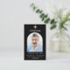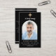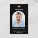 A black background, a faux gold cross and an arch shaped frame for a photo. Personalise and add name, dates and your text and prayer. White text.