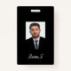 Black background, white text. A badge, name tag for large events such as milestone birthdays, wedding, conventions or business fairs. Add a photo and a name