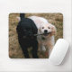 An adorable painting of a black lab puppy and a golden retriever puppy playing together, each holding her end of a big stick and running forward together with sheer joy. Mouse pad