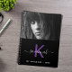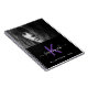A chic black background. Personalise and add your own photo, a name, monogram letter and a year. The name is written in white with a large modern hand lettered style script with swashes. Purple monogram letter. For school, work, diary and journalling. To keep the swashes only delete the sample name, leave the spaces or emoji's in front and after the name