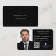 A classic business card on a black background. Personalise and add Your name, text, profile photo, contact info and your own QR code to your website address or social media account. Facebook icon.