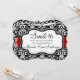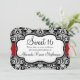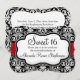 Stylish, elegant and posh bracket shaped black and white damask background design, with red ribbon and white frame shape. A cute girly girl's style. All Designs Copyright © CustomInvitesOnline.com