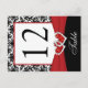 This romantic double-sided black and white damask table number postcard has a PRINTED red ribbon and a pair of PRINTED red FAUX glitter and jewel joined hearts on it that matches the wedding invitation shown below. **You must change the number 12 to each of the table numbers you need, add it to your cart, and then return and repeat the process until you have all the individually numbered cards that you need in your cart. Stand it on a small easel, or in your centerpieces. If you need assistance, email niteowlstudio@gmail.com.