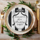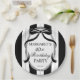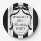 Elegant Black and white retro stripes bow birthday party monogrammed printed paper plates template, adults birthday party personalised name paper plates, stripped birthday party personalised table decor, oval ribbon bow border party printed paper plates, retro birthday personalised tableware, coquette birthday party personalised paper plates