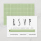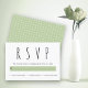 Modern black, white, green typography wedding RSVP response card. It features the word RSVP in black in a modern font and a band in sage green. The back includes a geometric pattern in white on sage green.