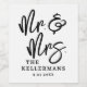 These custom wine label stickers feature a clean, all-white background with “Mr. & Mrs” in large black handwritten script as the focal point. Directly below, the couple’s last name and wedding date appear in classic black serif fonts, creating a timeless and balanced design.