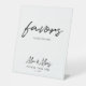 A simple minimalist white background and black script text "favours" wedding table sign to encourage your guest to take a wedding favour.