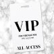 At the bottom, "VIP" is displayed in a bold serif font, paired with simple typography for the event name, date, and "All Access."