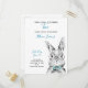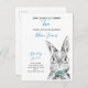 Your baby boy is turning two! Invite your special guests with this adorable invitation postcard featuring a hand painted watercolor bunny rabbit, in blue, black and white. Baby's name, "Two" and the date are in blue hand lettered script typography, and personalised in a chic modern black sans serif. Copyright Elegant Invites, all rights reserved.