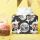 Personalized wrapping paper with five of your photos against a black background with white stars. The photos fit into a round white frame. Simply pick five photos you love for this starry wrapping paper, perhaps of your family or the birthday girl or boy, and upload them to the template.