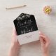 All in one modern minimalist wedding invitation featuring pretty string lights and elegant signature script name and monogram initials on a black background. The invitation includes a perforated RSVP card. Designed by Thisisnotme©