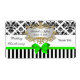 A design with a black and white damask pattern paired with a black and white striped pattern. It's embellished with a lime green look bow ribbon.