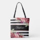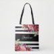This tote bag features modern watercolor burgundy and blush flowers with foliage on a striped background with faux rose gold. Personalise it with a name or your initials.