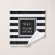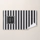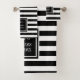 Elegant personalised initials monogram bath towel set featuring a black and white striped pattern with your initials and family name with your established date set in a black-bordered square with a classic white text. Designed by Thisisnotme©