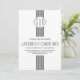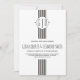 Black white stripes and monogram wedding invitation. It displays vertical stripes in the centre with a circle with your initials and two little hearts and your text. The black includes a black and white striped pattern.