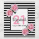 A label for a 21st birthday party. Classic slim black and white stripes as background. With girly and feminine pink roses as decoration.