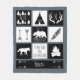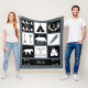 This amazingly stylish and fun black and white tribal woodland adventure blanket is sure to please. It features bear, wolf, antlers, trees, arrows, and a tribal patterned feather over black and white squares. The bottom centre has a personalised name area with accenting white arrows. There is also a changeable monogram letter inside the white antlers. The background of the blanket is a grey colour which can be changed by customising the background colour. This blanket comes in all sizes even a small baby sized one making it great for a baby shower gift!