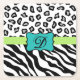 Black White Turquoise Zebra Leopard Skin Monogram Square Paper Coaster
