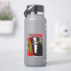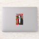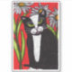 This vinyl sticker has a black and white tuxedo cat with green eyes sitting in front of white daisies with green leaves on a vibrant red background.