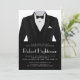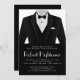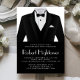 This classy men's birthday party invitation features an image of a black tuxedo with white shirt and black bow tie. The invitation and details appear in white sans serif type, with the guest of honour's name in an art deco-inspired font. The back is solid black.