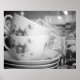 Original soft black and white photograph of vintage floral teacups stacked one inside of the other on top of a table next to glass water goblets printed on a 16x20 poster print. A BohippianFinch original photograph.
