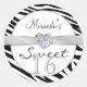 Black and white zebra border decorated with printed images of silver white ribbon and jewel in the shape of heart Sweet 16 Birthday Party Sticker. The matching items are shown below: