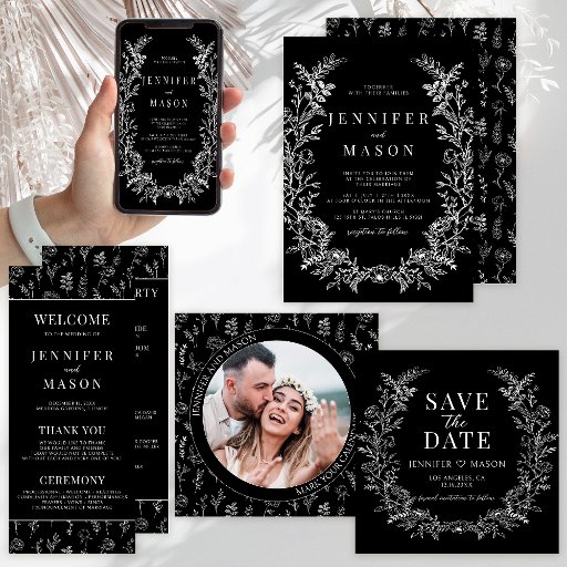 Enhance the allure of your rustic wedding invitations or save-the-date announcements by choosing these elegant black floral envelopes adorned with delicate wildflowers.