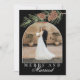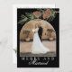 Merry & Married Black and White Winter Pine Cone Greenery Botanical Photo Christmas Card - Night Black Christmas Photo Card for Newlyweds - Celebrate your first Christmas as newlyweds with this elegant holiday card featuring a dark black background with white accents and festive pine greenery. The trendy arch-shaped photo frame highlights one cherished image—ideal for a wedding or engagement photo. Beautiful calligraphy adds a romantic touch, and the back includes an editable message area for personalized greetings. A stylish way to share winter wishes and mark your "First Christmas as Mr. & Mrs."