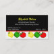 Whimsical teachers business card, with cartoon graphics of red, yellow, and green apples lining the bottom and a black text area. Customise the front and back to suit your needs. Nice business card template for teachers and tutors.