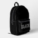 Backpack all over print cut sew style storage bag printed with Black With Grey Text On Black Solid Colour graphic art design illustration and select products collection by TheFabricSeal print on demand shop at Zazzle.com #ZazzleMade https://www.zazzle.com/store/thefabricseal TheFabricSeal©️Original.