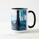 Black wolf standing alone in the shadows of a dark forest. The nature scene is backlit with a bright sun beaming icy blue lighting through the trees.