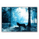 Black wolf standing alone in the shadows of a dark forest. The nature scene is backlit with a bright sun beaming icy blue lighting through the trees.