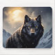 A majestic black wolf with piercing yellow eyes stands on a snowy mountain peak, gazing intently at the viewer. The wolf's fur is thick and dark, contrasting sharply with the white snow and the bright yellow moon in the background. The scene is bathed in a soft, ethereal light, creating a sense of mystery and wonder. Perfect gift for wolves and wildlife lovers.