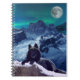 A gothic notebook featuring a hauntingly beautiful black wolf surrounded by snowy mountains under a moon lit, aurora borealis sky. Digital artwork by me 🖤