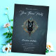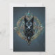 Black wolfs head with piercing blue eyes, set against a circular, ornate background. The background is a complex design of gold and iridescent patterns, resembling a magical symbol. The wolf's fur is detailed with intricate lines and shading, giving it a mystical and powerful presence.