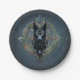Black wolfs head with piercing blue eyes, set against a circular, ornate background. The background is a complex design of gold and iridescent patterns, resembling a magical symbol. The wolf's fur is detailed with intricate lines and shading, giving it a mystical and powerful presence.