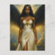This angel-core postcard features a dark-skinned Black woman with long, wavy hair as an angel. She wears a white dress with gold accents and a laurel wreath accessory on her head. She has large, feathered black wings. The vintage oil painting style portrait has a heavenly/celestial backdrop with clouds and rays of light. A melanin-rich ethereal artwork of a biblical creature rooted in Christianity.