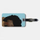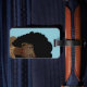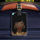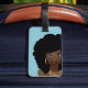 This luggage tag design features an African American woman with full afro and red lips on a turquoise background. Stand out at baggage claim with this luggage tag.