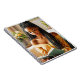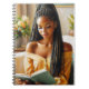 This notebook features artwork of a pretty black woman with long braided hairstyle, wearing an off-the-shoulder yellow top, reading a book indoors. She is sitting in a living room on a couch with potted plants behind her. An oil painting portrait of a serene reader. The image is bright with a light, sunny colour scheme.