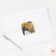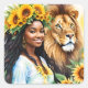 Stickers feature watercolor artwork of a pretty, smiling black woman adorned by and surrounded by sunflowers next to a large, majestic lion.