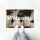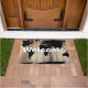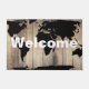 This doormat is perfect for the well travelled family. It's black world map is silhouetted over a light rustic wooden planks background. The word welcome is in white bold thick letters.