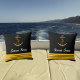 A classic black background. Decorted with faux gold anchor and 4 captain stripes. Personalise and add the boat name.