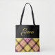 Modern, elegant and trendy customisable tote bag features "personalised name" on black background at the top and pink / yellow plaid tartan at the bottom.