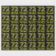 This bold, fun, birthday-themed wrapping paper design features a large number "72", with a black and yellow striped pattern. It also features the message "Happy 72nd Birthday,", and a personalised name. The background is coloured black. Birthday themed wrapping paper like this might be used when giving a gift or present in celebration of somebody’s seventy second birthday. [~Z0000381]