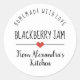Simple "homemade with love" sticker featuring "blackberry jam" with a black font on a simple white background embellished by a cute red heart. Customise text.