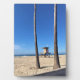 View of the famous local surf spot "Blackies" from the parking lot in Newport Beach, California. The lifeguard Tower 22 in between 2 palm trees. Back in 1953, William "Blackie" Blackstock opened the dive bar, Blackies by the Sea. Since then, locals have called this beach "Blackies", and it is a popular surf spot for long boarders and beginners. Photo taken November 2022.