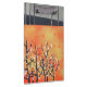 A landscape painting of Blackthorn blossom in spring on a coral orange background.