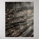 Massive dark shadows are thrown over the brown earth in the midst of a misty foggy forest.