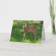 A photograph of an adorable fawn in the bright green grass at the edge of the woods