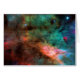 The powerful radiation from these stars evaporates and erodes the dense cloud of cold gas within which the stars formed. The blistered walls of the hollow cloud shine primarily in the blue, green, and red light emitted by excited atoms of hydrogen, nitrogen, oxygen, and sulphur. Particularly striking is the rose-like feature, seen to the right of centre, which glows in the red light emitted by hydrogen and sulphur.
